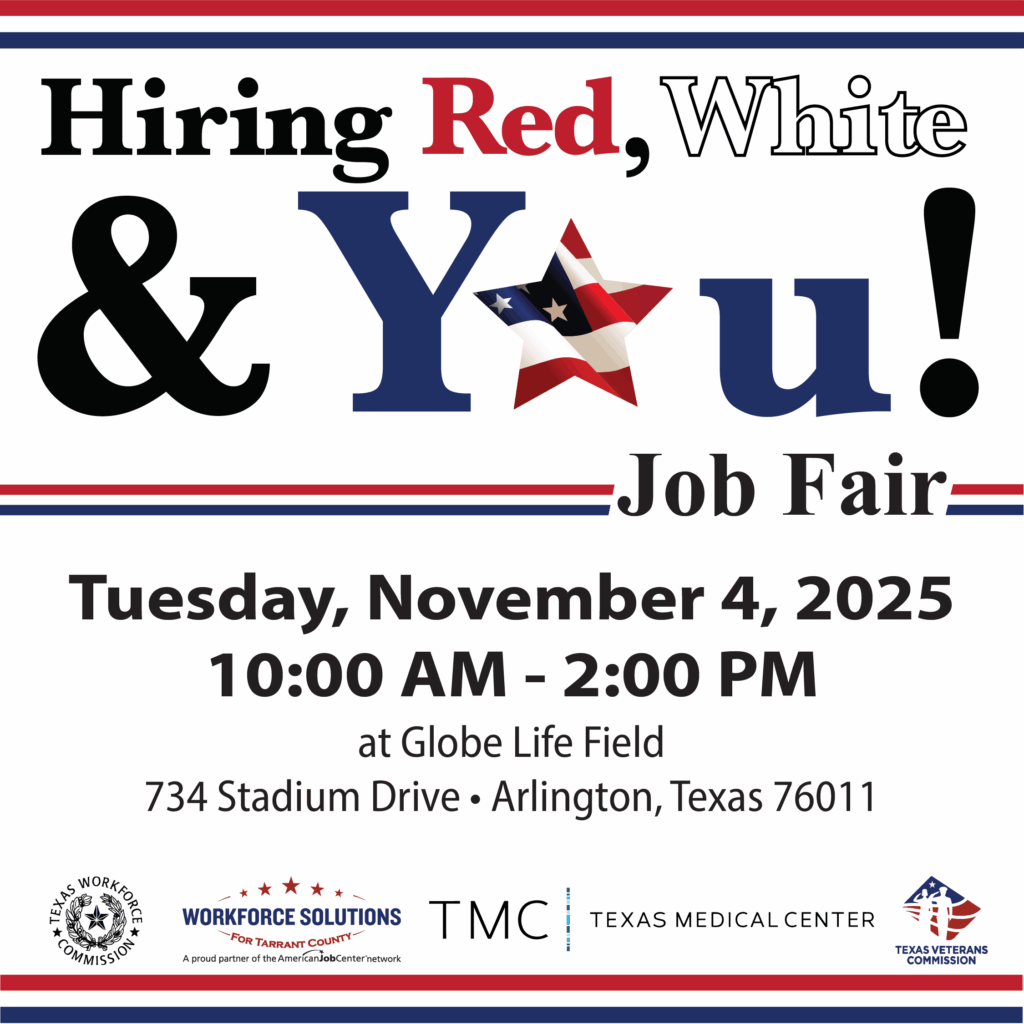 TARRANT COUNTY, Texas (October 28, 2025) – 165 local employers with over 12,625+ open positions are set to attend the 14th Annual Hiring Red, White and You! Job Fair on November 4th at Globe Life Field in Arlington. The job fair, hosted by Workforce Solutions for Tarrant County, Texas Veterans Commission (TVC) and the Texas Workforce Commission (TWC), begins at 10:00 a.m. and ends at 2:00 p.m. Parking is FREE! Globe Life Field Parking Lot A; overflow in Lot R. Pre-Registration is encouraged at hrwyjobseeker.eventbrite.com but not required (can register onsite). The event is open to everyone but will give priority access to veterans.